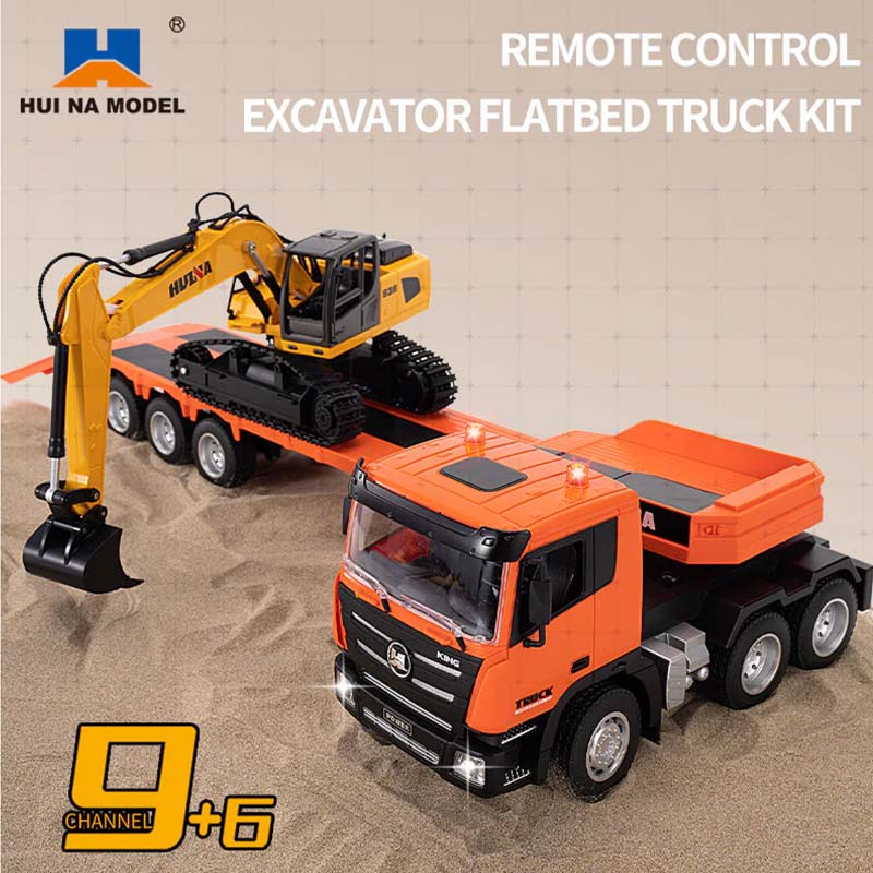 Huina 1319 1/24 Scale RC Flatbed Trailer and Excavator 2-in-1 Combo Set 9-Channel Heavy Transport Truck with Loading Ramps RTR